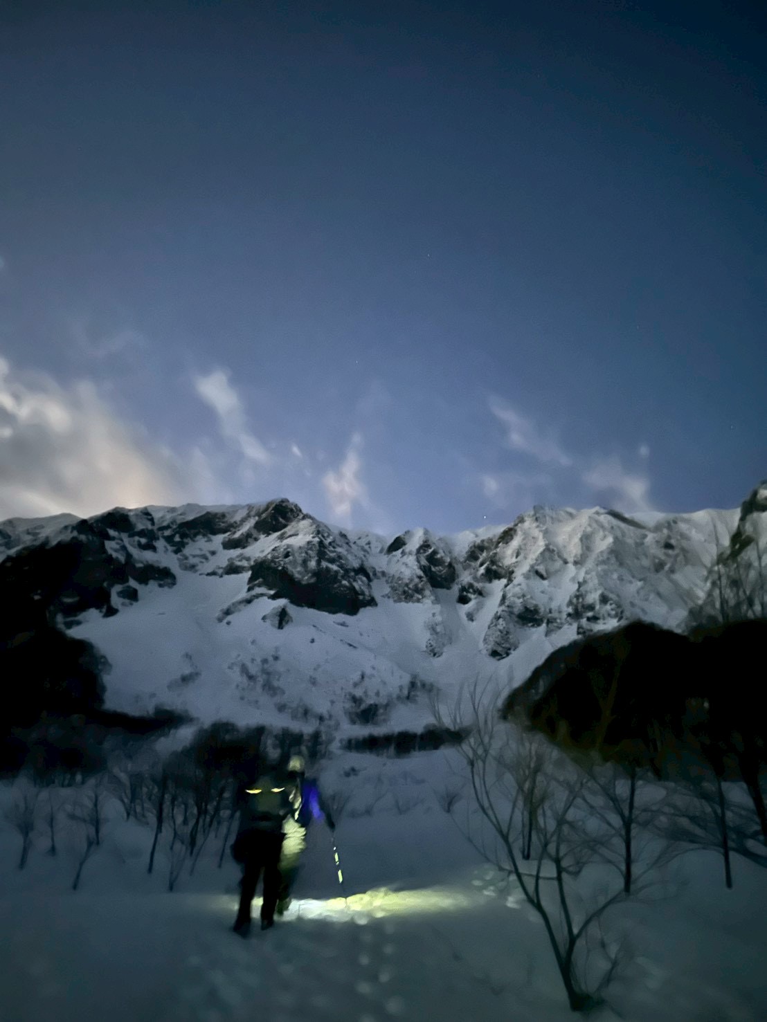 初日は、兵庫県の葛根腰痛地蔵尊と松尾神社を参拝し大山登山口駐車場よりスタート。新雪はなくノーアイゼンのまま元谷避難小屋に到着。大山の壮大さに感動しながらの幕営でした。