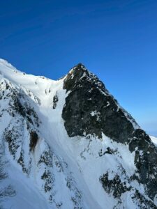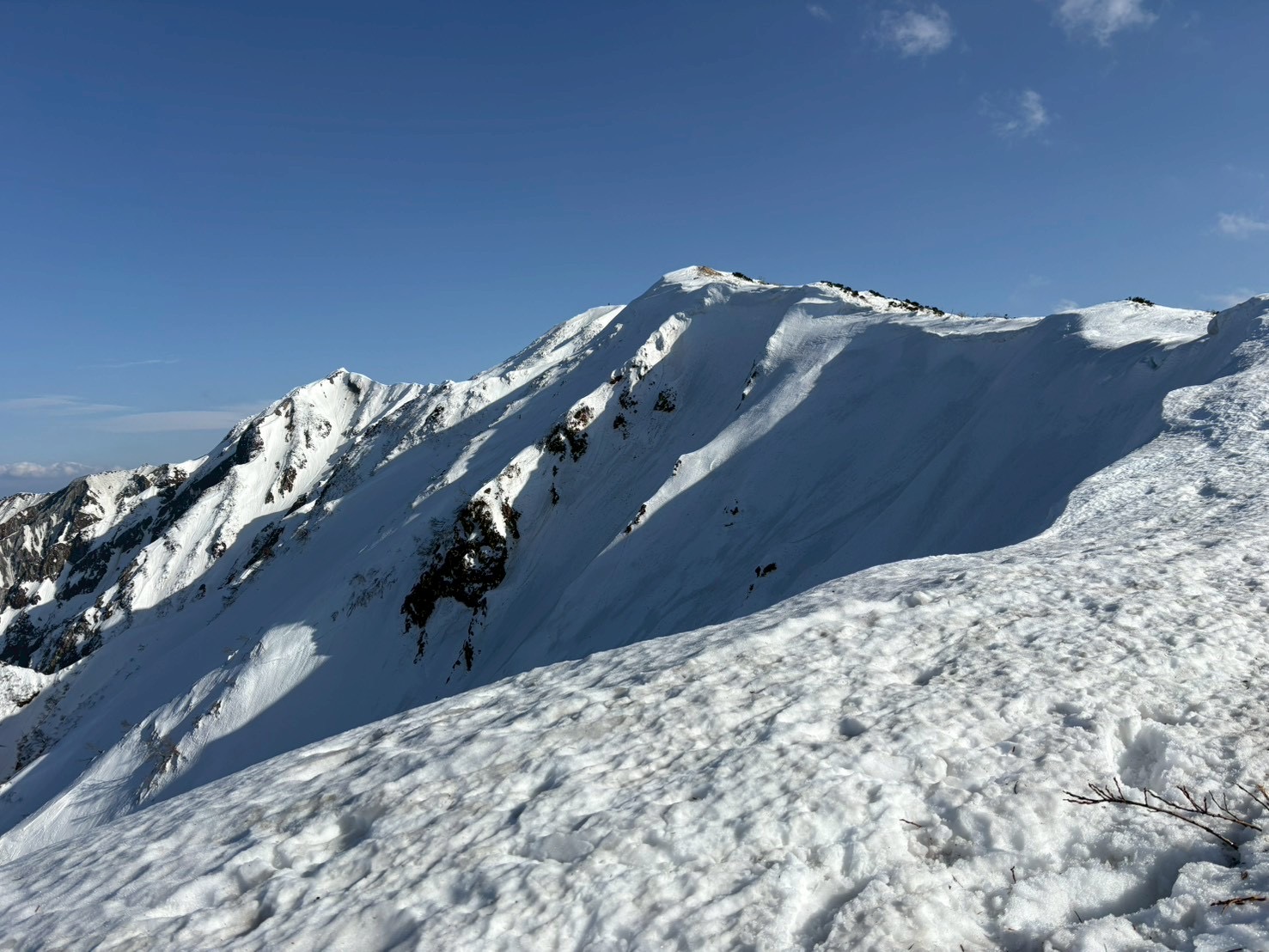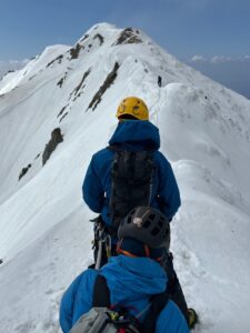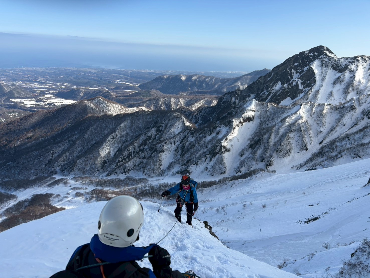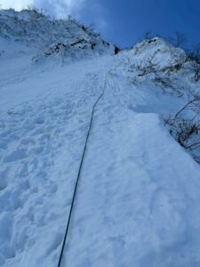 西稜は先行パーティーのトレースがしっかりありましたが、TOまで60mロープでスタカットで登りました。数日前からの晴天のため雪は腐りかけていました。