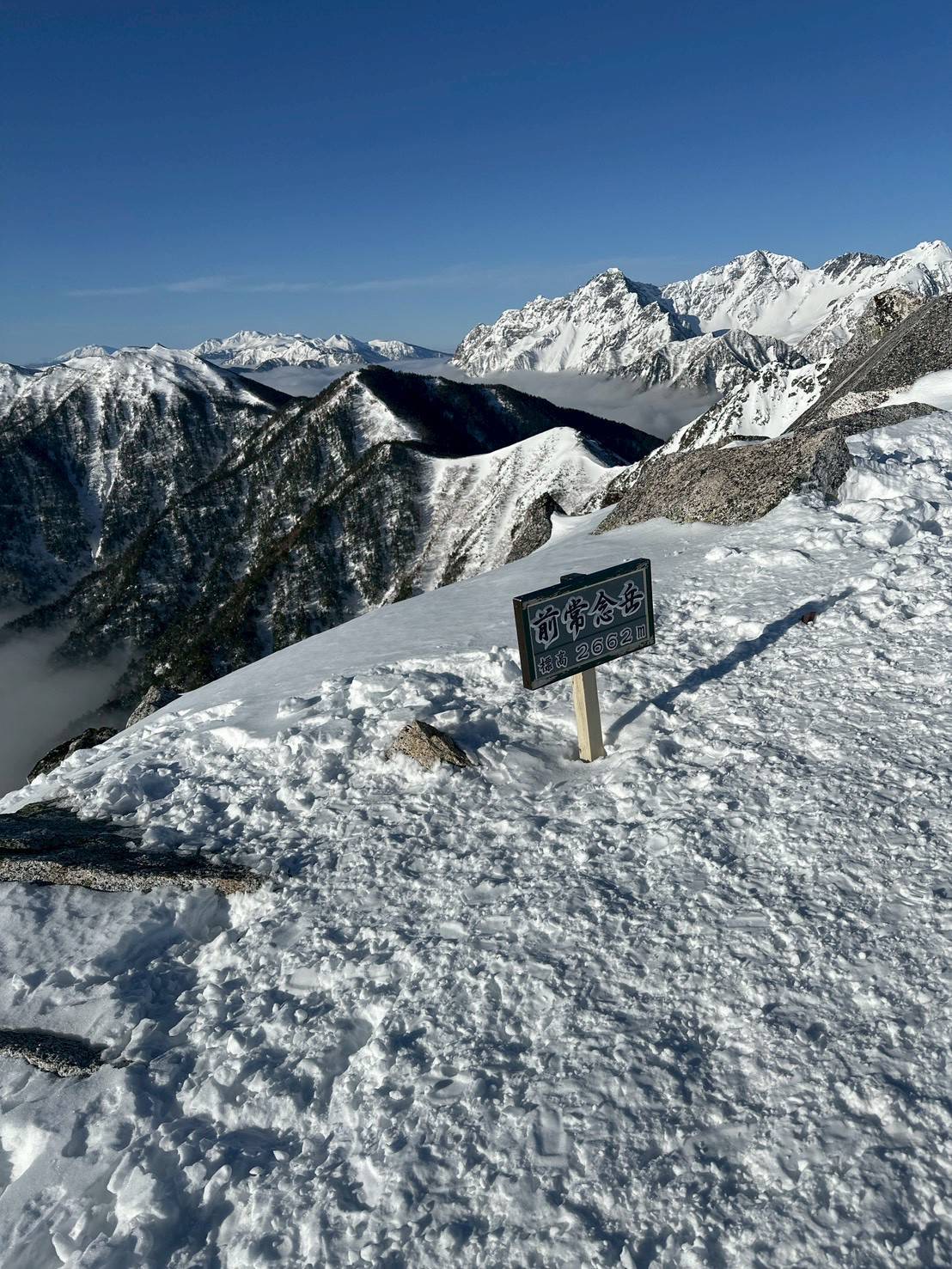 16日 : 5:20に出発。ひたすら尾根を登り、前常念岳の急登部にさしかかる頃に雲海の上に太陽が顔を出す。8:30に常念岳に到着。360°雲海が広がり、雲の上に頭を出した遠近の山々の山座同定を楽しんだ後に下山を開始。14:58に林道ゲートに到着した。幾度も登った常念岳だが、穂高をはじめ北アルプスの山々の眺めは今回が最高であった。